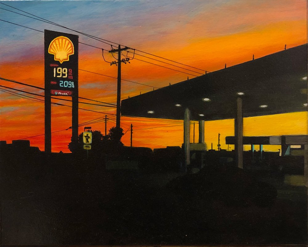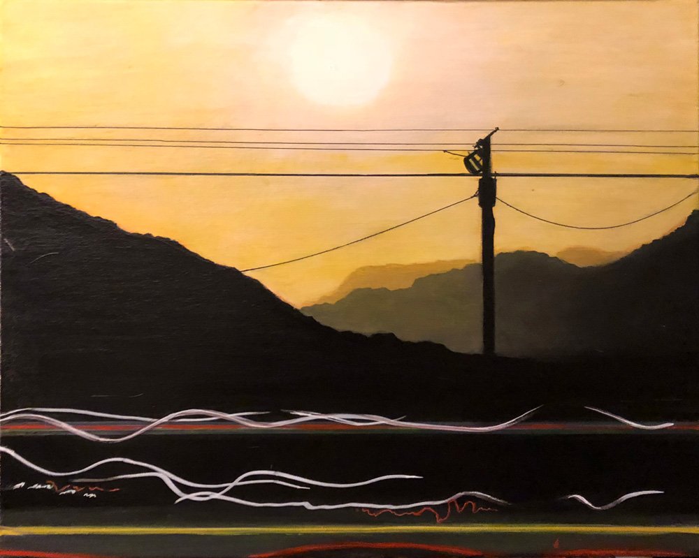 This series explores the familiar and mundane through a perception of time and space, history, and aspirations. Travel for me, especially in an automobile, is about as common an experience as you can get. It is tedious for most, but I find myself captured by the metaphor of having left a place and headed to another, while the present blurs by in my peripheral vision. The simple metaphor of our lives and the fleetingness of now. On long trips, especially when occurring in deserts and plains, compositions of light and landscape create a Drishti - a point of focus that allows for a transcendent experience and ultra-awareness of place and time, helping me to contemplate the realities of time. The past, present, and future converge, and the illusion recedes to reveal a sliver that exists between the past and future - the now. For me, the artmaking process is similar to this experience. I'm aiming to find that sliver between idea and execution and remain there: I am not just seeking to achieve an end product but to find the raw, creative sense of wonder within the act of making. My hope is for the viewer to find perspective, contemplation, and consolation in the mundane business of day-to-day life and to consider the moment in time in which one exists in relation to their past and future. I have a coinciding series of paintings that focus on the peripheral passing moments rather than the driver's perspective of the past and future. In most of these paintings, I use oil on acrylic or latex, or just acrylic. I enjoy painting on found objects as well as stretching my own canvas.