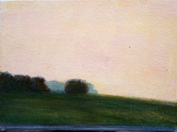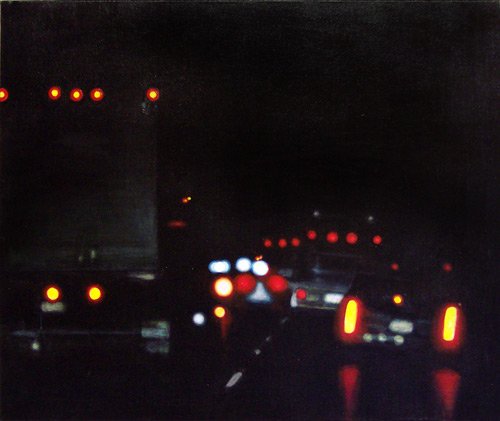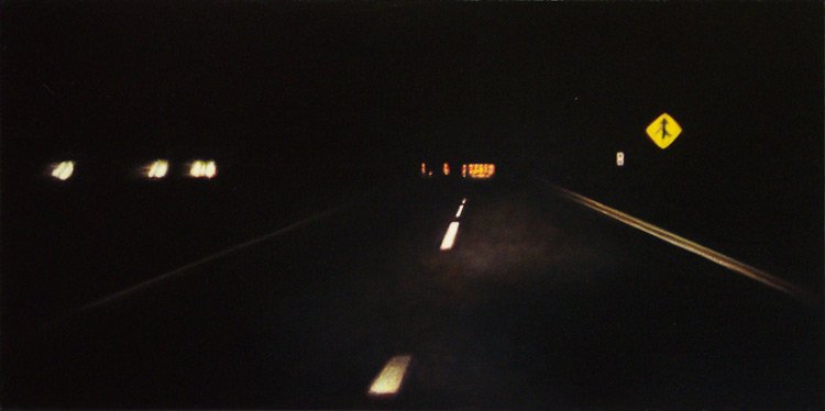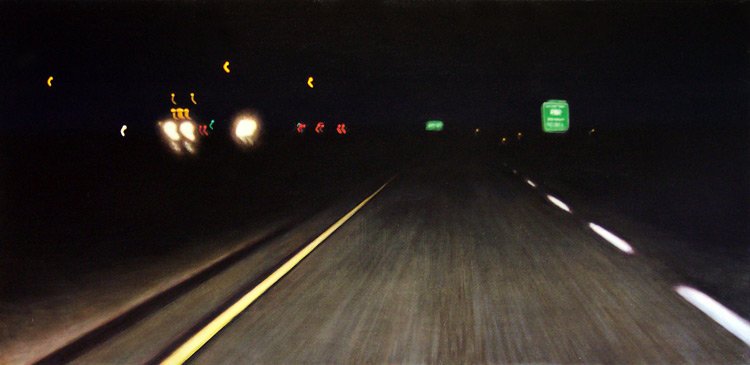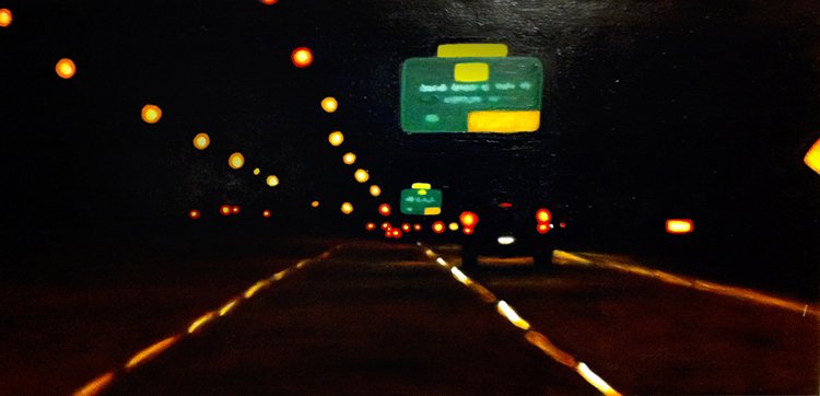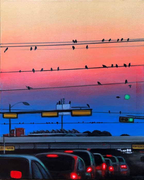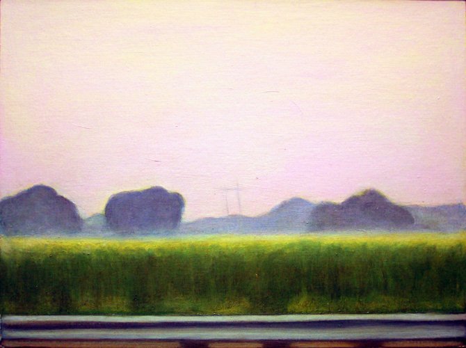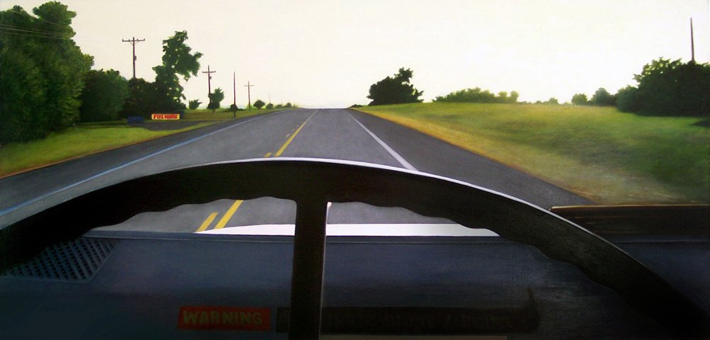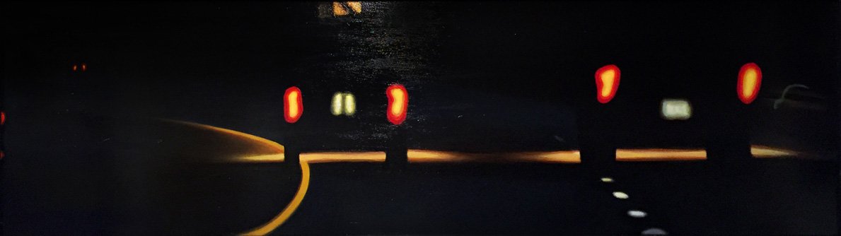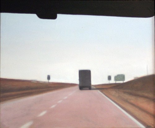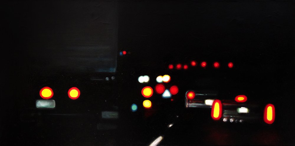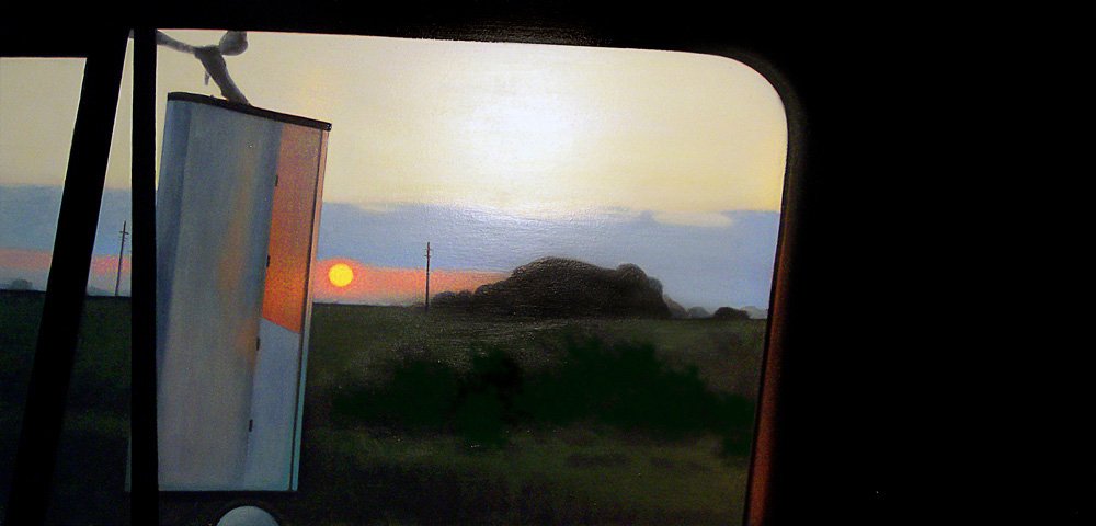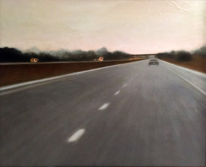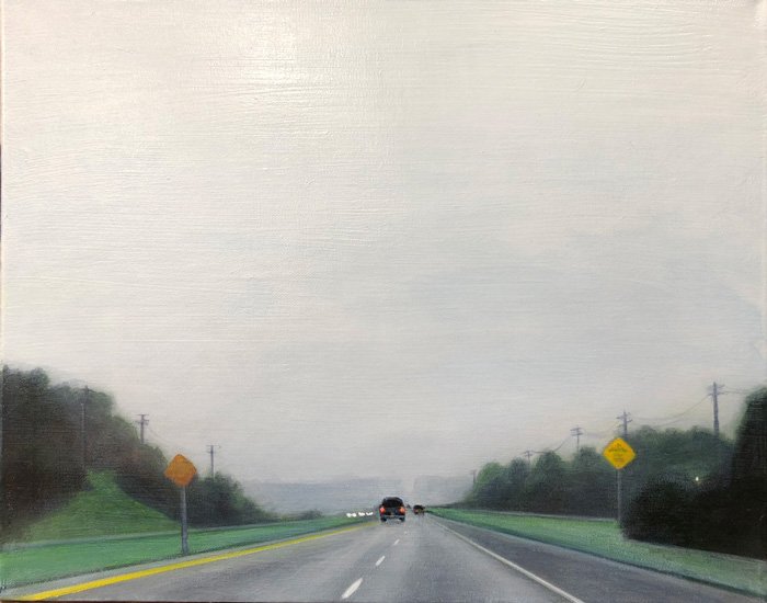 This series explores the familiar and mundane through a perception of time and space, history, and aspirations. Travel for me, especially in an automobile, is about as common an experience as you can get. It is tedious for most, but I find myself captured by the metaphor of having left a place and headed to another, while the present blurs by in my peripheral vision. The simple metaphor of our lives and the fleetingness of now. On long trips, especially when occurring in deserts and plains, compositions of light and landscape create a Drishti - a point of focus that allows for a transcendent experience and ultra-awareness of place and time, helping me to contemplate the realities of time. The past, present, and future converge, and the illusion recedes to reveal a sliver that exists between the past and future - the now. For me, the artmaking process is similar to this experience. I'm aiming to find that sliver between idea and execution and remain there: I am not just seeking to achieve an end product but to find the raw, creative sense of wonder within the act of making. My hope is for the viewer to find perspective, contemplation, and consolation in the mundane business of day-to-day life and to consider the moment in time in which one exists in relation to their past and future. I have a coinciding series of paintings that focus on the peripheral passing moments rather than the driver's perspective of the past and future. In most of these paintings, I use oil on acrylic or latex, or just acrylic. I enjoy painting on found objects as well as stretching my own canvas.